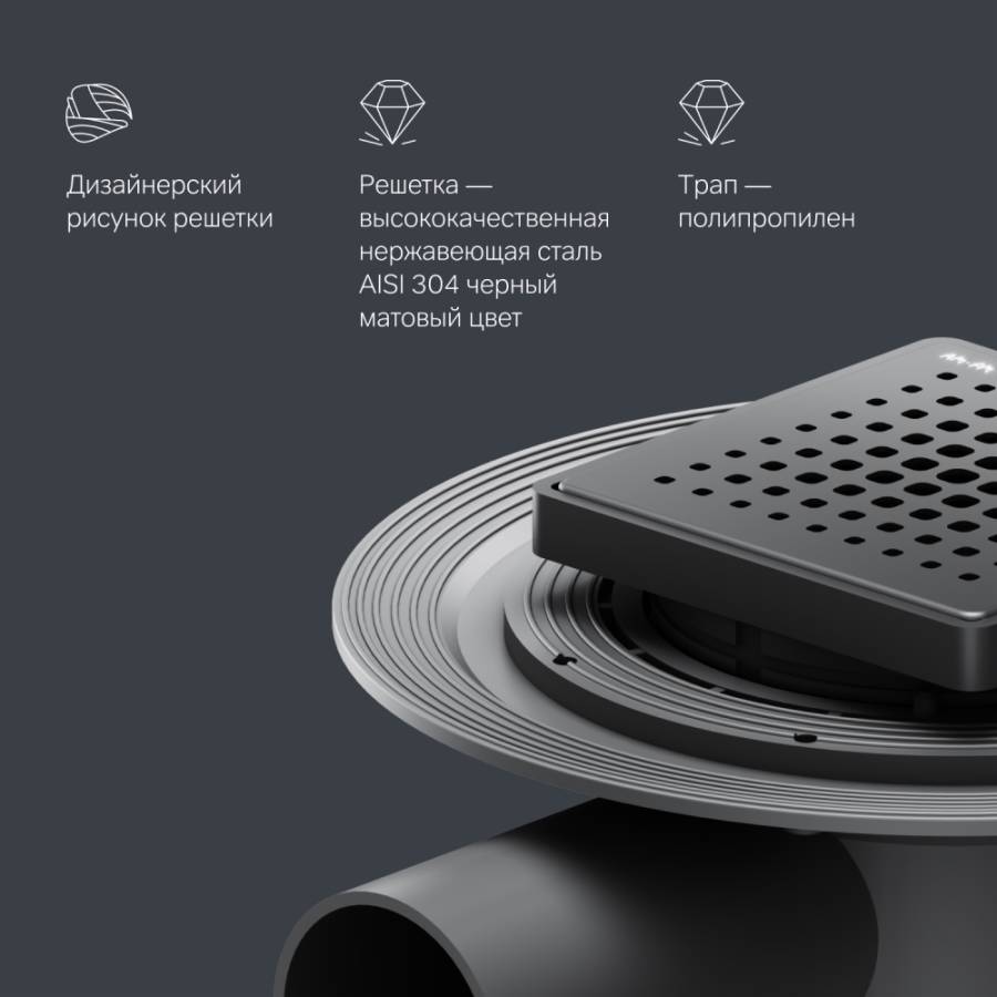 Выход изделия на 50 мм. Размер трапа 10 см. Дизайн продукта выполнен в элегантном матовом черном цвете. ""