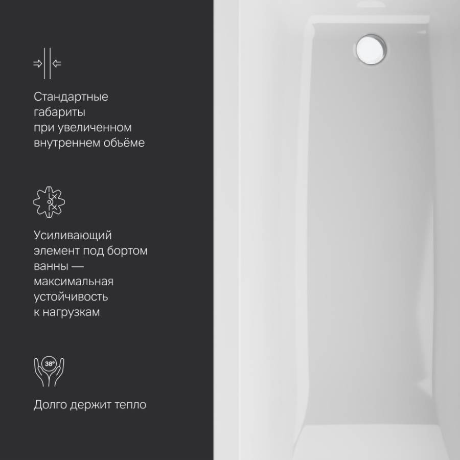 Удобная спинка и оптимальные размеры ванной гарантируют полное расслабление и хороший отдых. За счет низкой теплопроводности и теплоемкости акрила ванна поддерживает температуру набранной воды_x000D_
