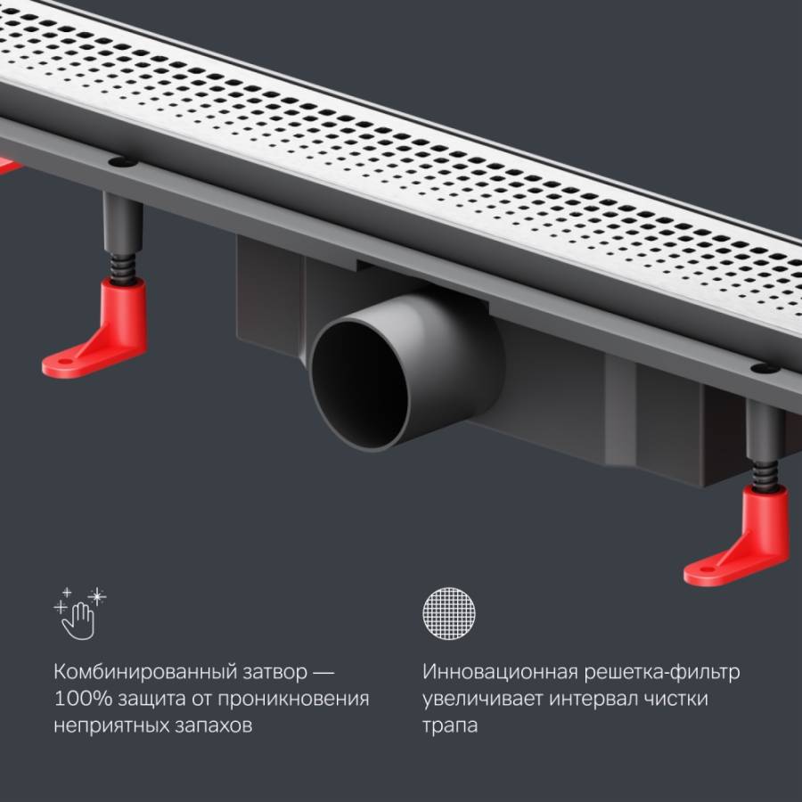 Продукт обладает низкой высотой монтажа и возможностью регулировки что предполагает экономию бюджета при заливке пола. Трап имеет инновационную конструкцию решетки с фильтром что значительно увеличивает межсервисный интервал._x000D_
