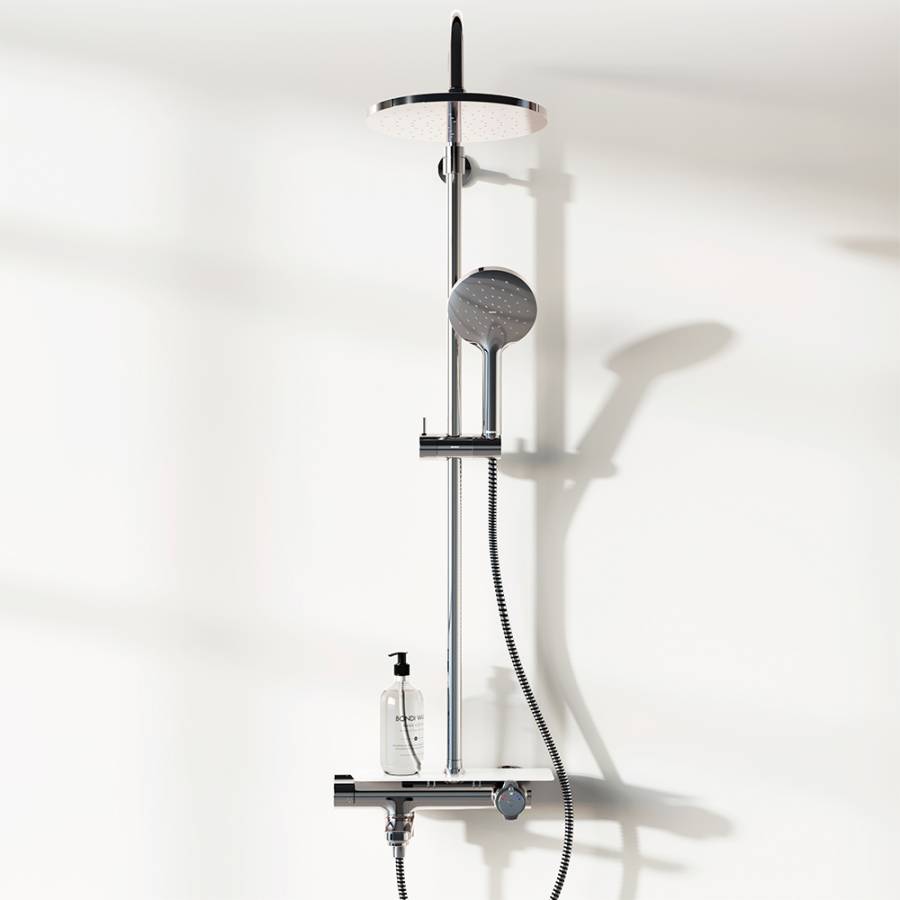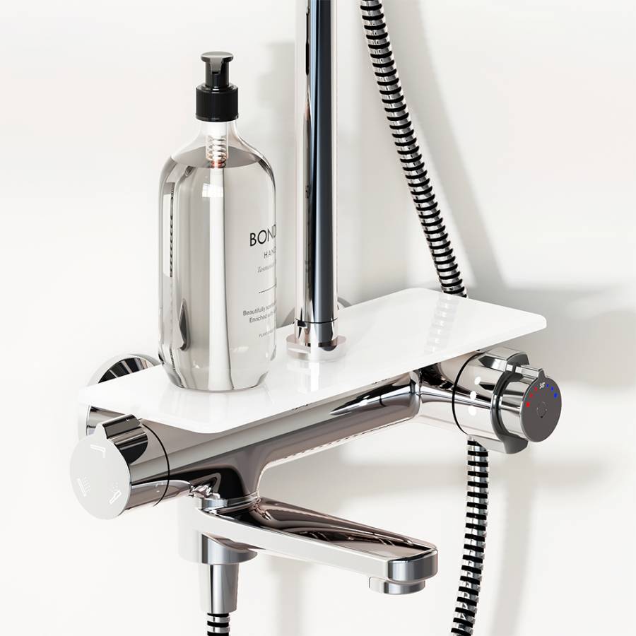 Непревзойдённый комфорт и удобство: смеситель выполнен в виде компактной полочки где вы можете хранить все необходимые вещи. Благодаря телескопической штанге с диапазоном регулировки 400 мм ежедневные процедуры будут одинаково комфортны для людей любого роста. Большое количество форсунок с микроотверстиями которые распределяют поток мягкими равномерными струями обеспечит вам расслабляющий эффект настоящего домашнего SPA._x000D_