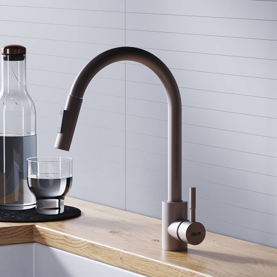 Утонченный элегантный дизайн сохранит свою актуальность на долгие годы и останется украшением на вашей кухне. Матовое покрытие в цвете Сатин - никаких разводов и следов капель безупречный внешний вид смесителя всегда. Удобная эргономичная ручка-стик обеспечивает легкое управление напором воды в одно касание._x000D_