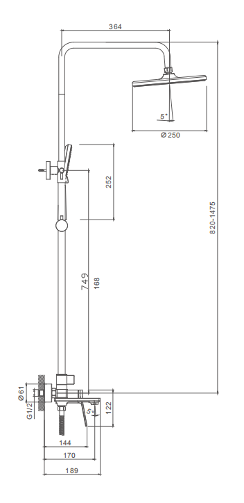 • Регулируемая душевая штанга: 840-1275 мм