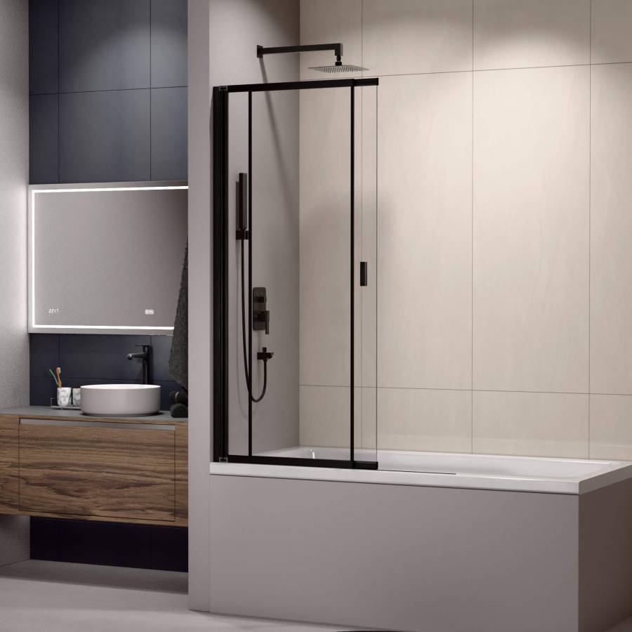 Профиль шторки выполнен в черном цвете, что прекрасно сочетается с любым стилем ванной комнаты. Высота стеклянной шторки составляет 1500 мм, что обеспечивает максимальную защиту от брызг и капель.