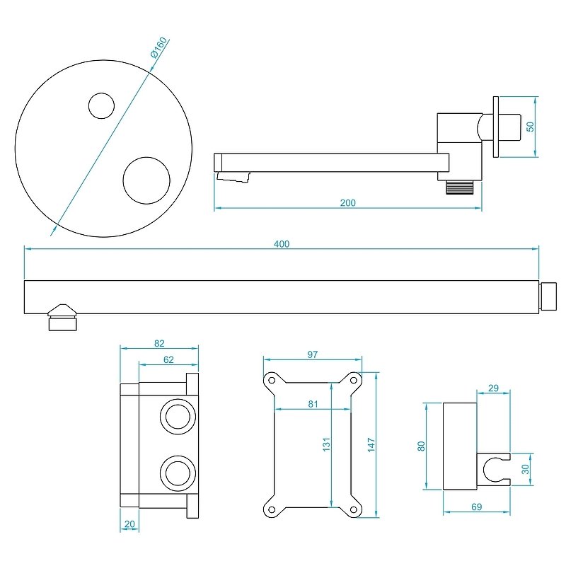 Смеситель для душа; Излив; Кронштейн для верхнего душа; Верхний душ; Ручной душ; Душевой шланг; Держатель ручного душа |