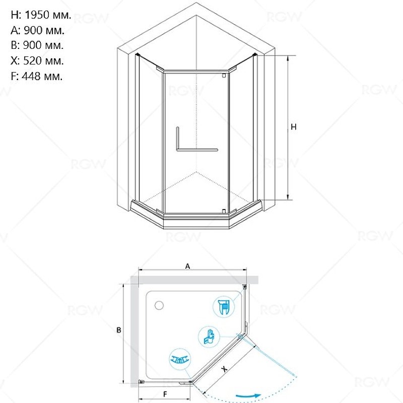 Конструкция дверей углового душевого угла RGW HO-081B является распашной, что делает уголок удобным и функциональным в использовании. Двери также обладают регулируемым профилем, что позволяет настроить уголок на определенный размер, что является большим преимуществом данного изделия.