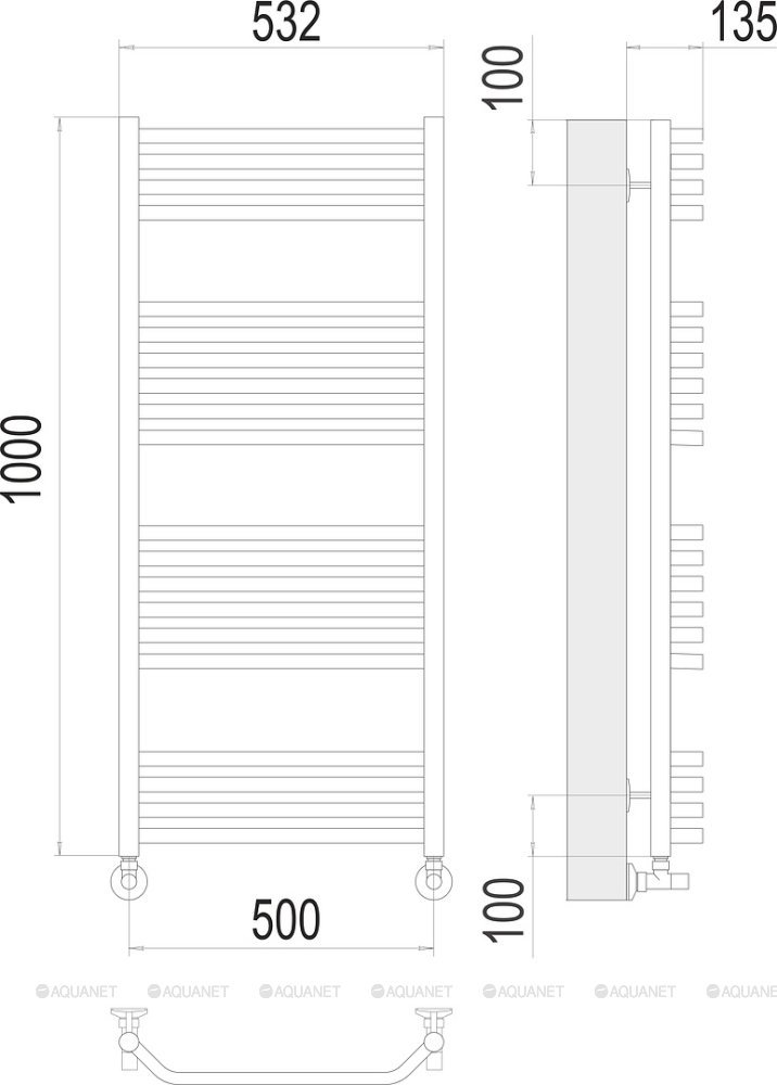 Полотенцесушитель - 1 шт.,Комплект креплений - 1 шт.,Комплект декоративных заглушек - 1 шт.,Кран Маевского - 1 шт.,Эксцентрик - 2 шт.,Отражатель - 2 шт.,Угловое соединение со сгоном - 2 шт. |